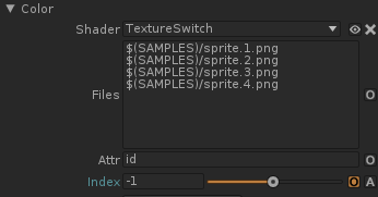 This node is used to switch between different textures, using an user attribute. The Files parameter is a list of texture files, and the Attr parameter is the name of the user attribute to read for the proper texture index.