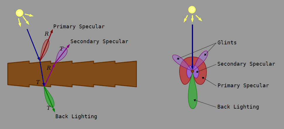 Guerilla Render provides a curve shader node, that exposes one diffuse and three specular components. Our reflectance model is based on Marschner's paper which is physically correct but has been tweaked to stay artist friendly and controllable.