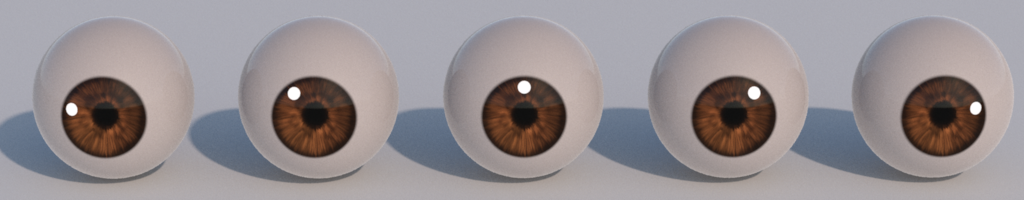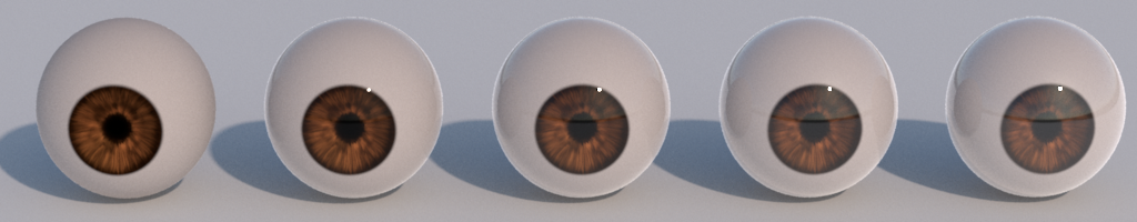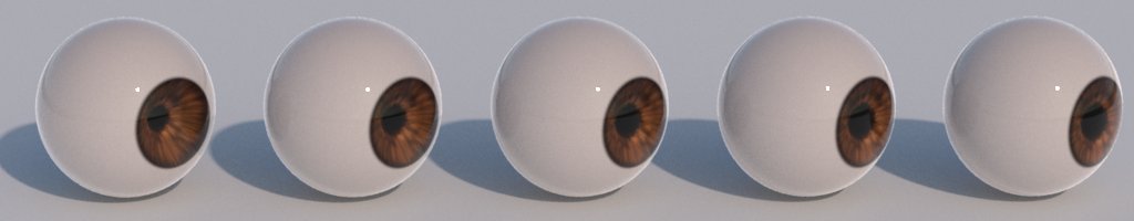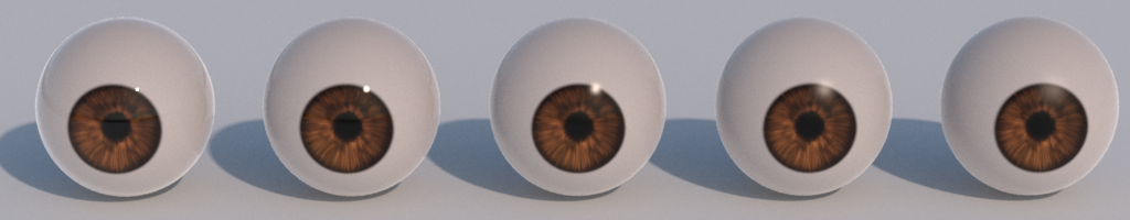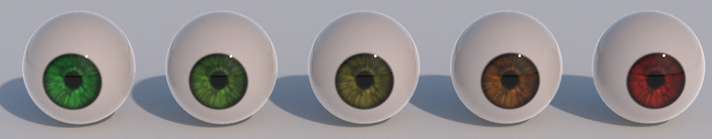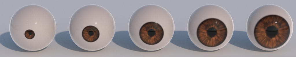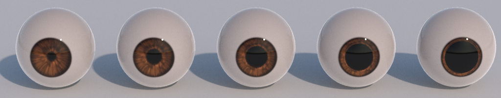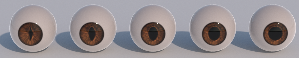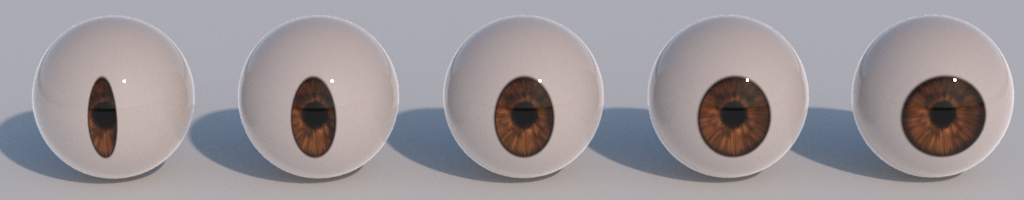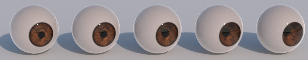 The Eye material is used to render character eyes, eyeballs, iris and pupil. The material simulates a refraction over the cornea, and models the iris a cone section.his material doesn't require any specific geometry and fits very well to non spherical eyeballs, as is commonly used on CG characters.