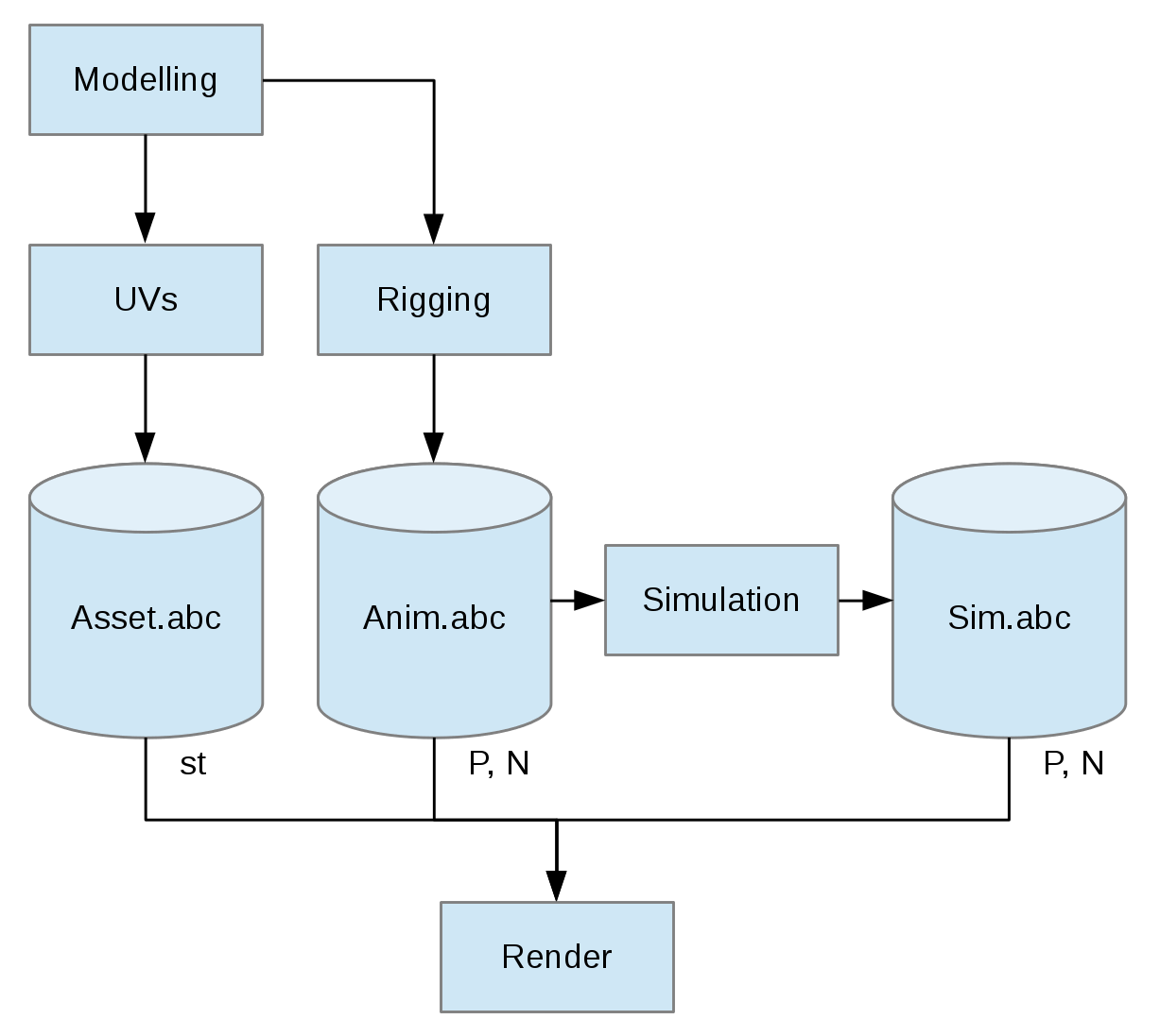 This example diagram shows how one can organize the data flow so animated positions and normals are coming from the animation stage, while st coordinates is coming from the UVs stage, both UVs and animation being decorelated. Additionally, simulation can be integrated on a selection of objects (typically clothes, skin.)