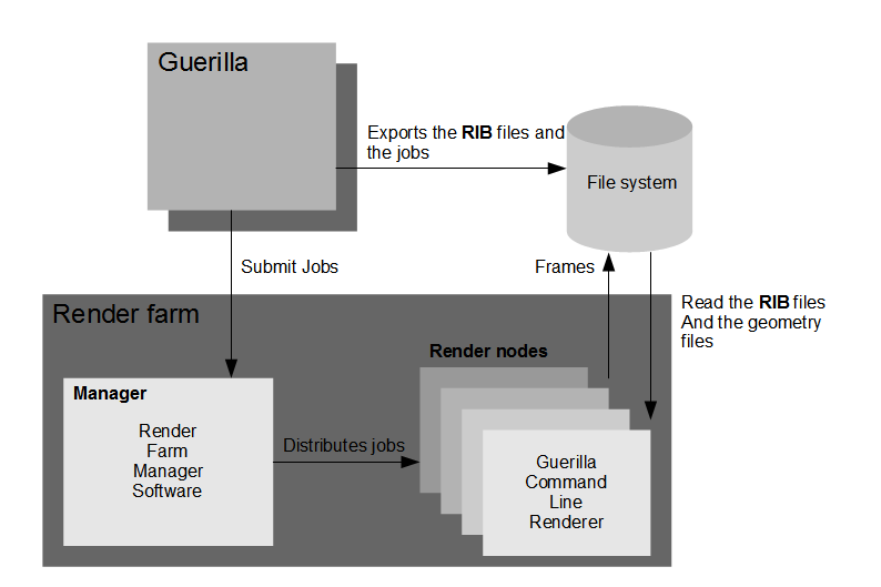 are generated by Guerilla. Then, Guerilla submit the jobs to the render manager, which dispatches