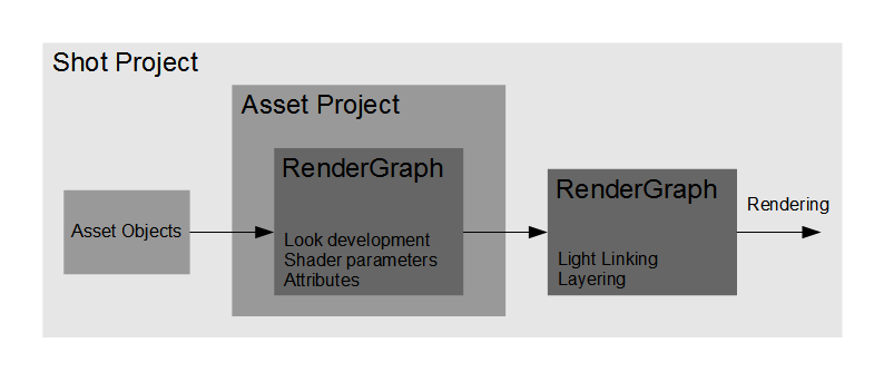 One can use a RenderGraph per asset project (with the asset look development setup) and one or more RenderGraphs per shot project (with the lighting/layering/tweaking work). This workflow makes it efficient to work with a large amount of objects on a lot of shots. It is for example easy to duplicate the setup of a whole shot onto another one.