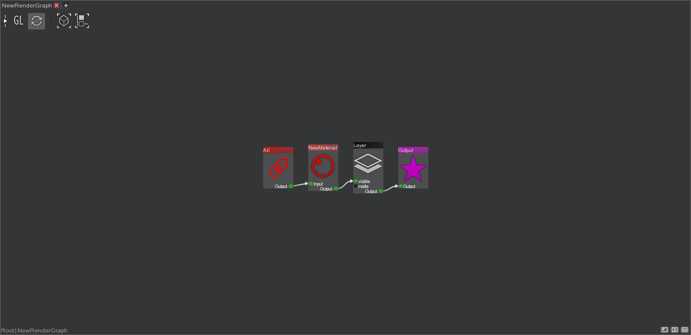 The Tag node selects all the primitives in the scene, since its Tag is 'All' and every scene graph node own the 'All' tag. The Tag node is connected to the NewMaterial node, which assign the NewMaterial to the selection since its Mode is 'Set Material' and Shader is NewMaterial. The NewMaterial node is connected to the Layer node which renders the selection in the Layer of the RenderPass, since its Render Layer is 'All' and the Layer has 'All' in its Layer Set. Finally the Layer node is connected to the Output node meaning that the graph will be evaluated and rendered.