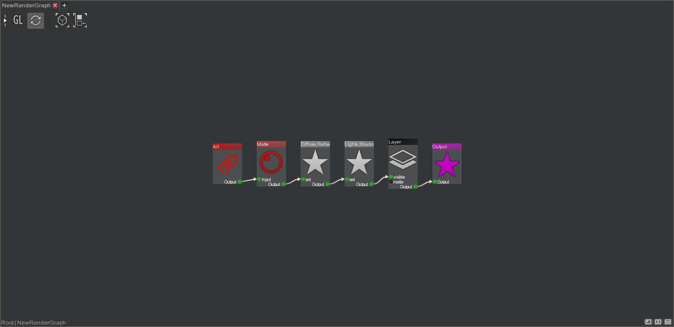 The Tag node selects all the primitives in the scene, since its Tag is 'All' and every scene graph node own the 'All' tag. The Tag node is connected to the Layer node which renders the selection in the Layer of the RenderPass, since its Render Layer is 'All' and the Layer has 'All' in its Layer Set. Finally the Layer node is connected to the Output node meaning that the graph will be evaluated and rendered.