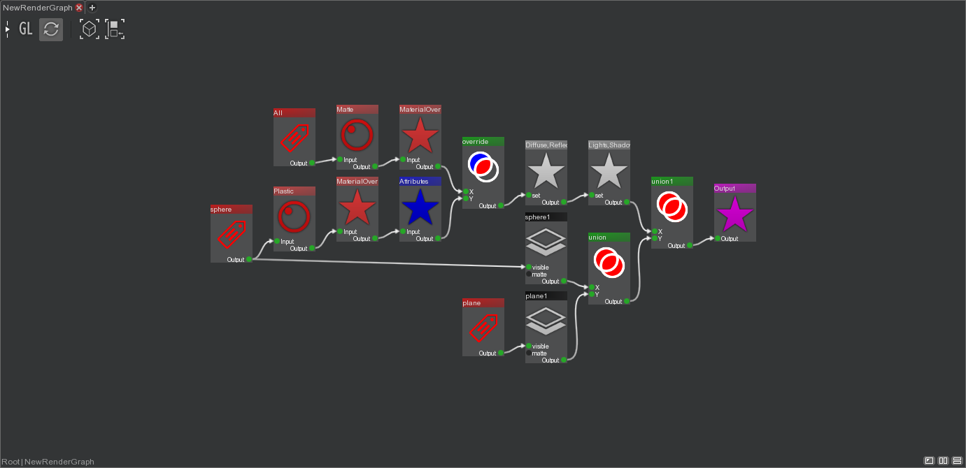 Double-click into the previous NewRenderGraph.Create a Tags:plane node, a RenderLayers:plane node, a RenderLayers:sphere node, two binop.union nodes andconnect them as in the graph below.- Render the image.
