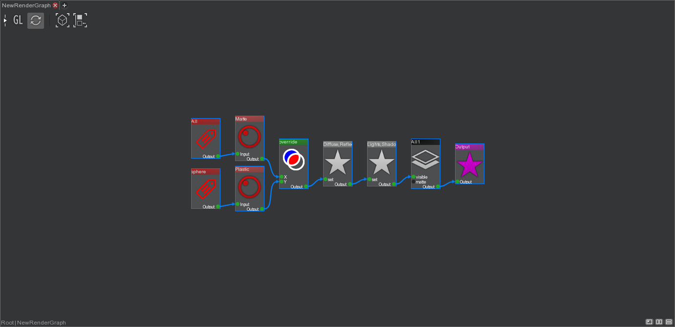 Use the Plastic material of the library.Double-click into the previous NewRenderGraph.Create a Tag node, a Plastic material node, a binop.override node andconnect them as in the graph below.- Select the Tag node and type 'sphere' in the Tag text box of a properties view.