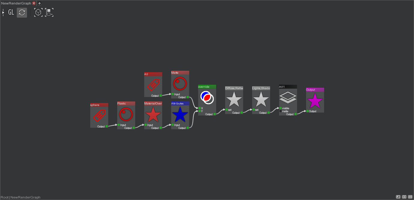 The Tag node sphere selects the sphere in the scene, since its Tag is sphere and and the sphere primitive owns this tag. The Tag node is connected to the Shader node, which assign the Plastic material to the selection, since its Mode is 'Set Material' and Shader is Plastic. The Plastic node is connected to the MaterialOverride node and overrides the Albedo and Roughness values of the Plastic material. The MaterialOverride node is connected to the Binop override node and overrides the Matte shader assignation, since there is an active shader assignation coming in X. Etc, ...