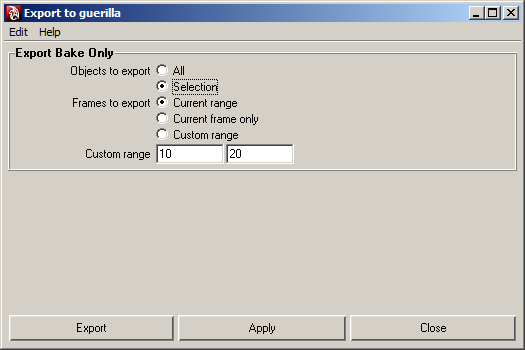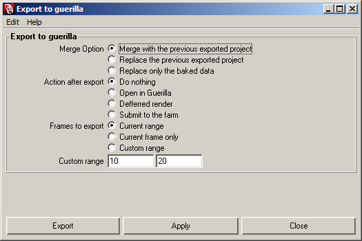 - Merge with the previous exported project (default) : export the baked data from maya but keep the work previously done in Guerilla on the project.
