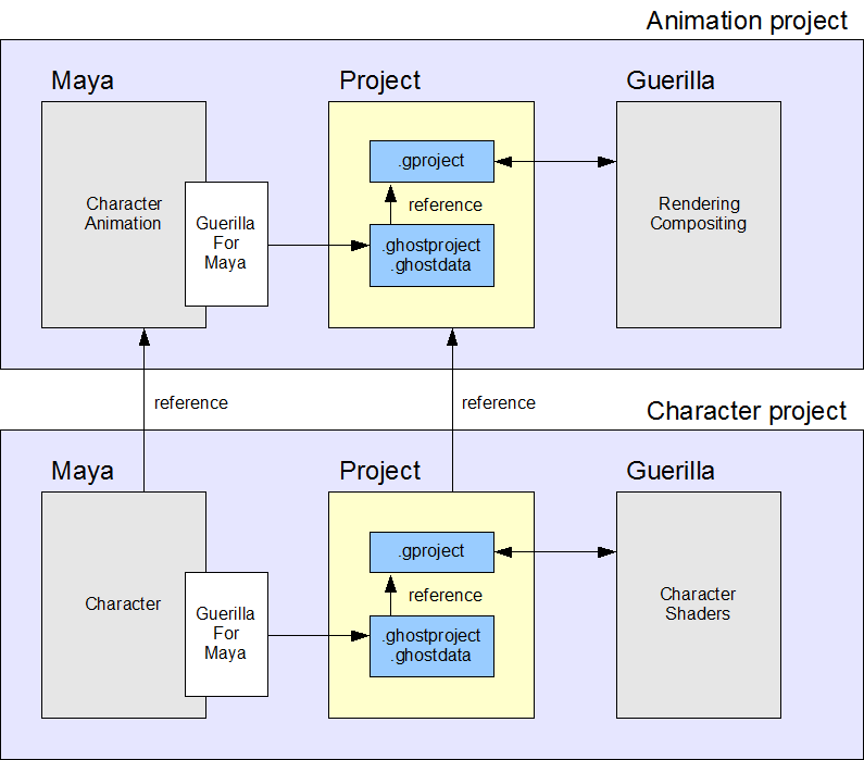 For example, let's say you have 3 Maya projects : One for the set, one for the character and one for the animation. The animation project references the set and the character. You will have to export :- A Guerilla project for the set, where you will work the lighting and the shading of the set.