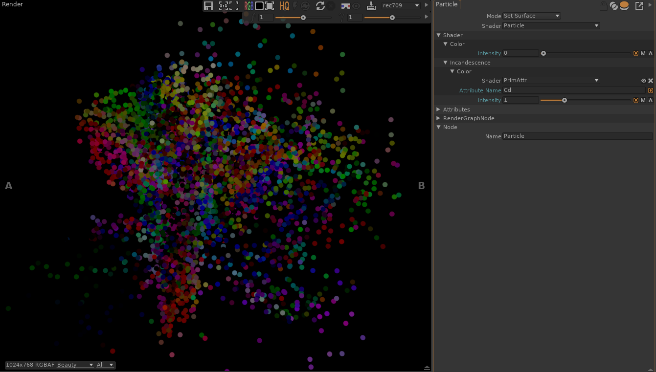 In this case, we use the common color attribute "Cd" (Color diffuse) to control the color of particle colors.