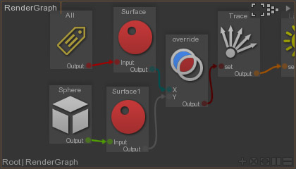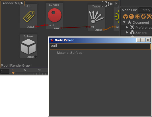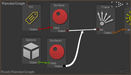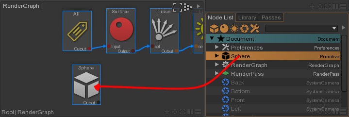 Connect the sphere to the new Surface node and drop the output of the surface node on the original Surface node output connection.