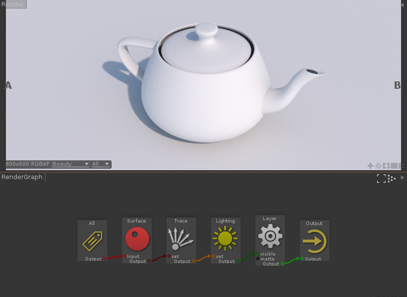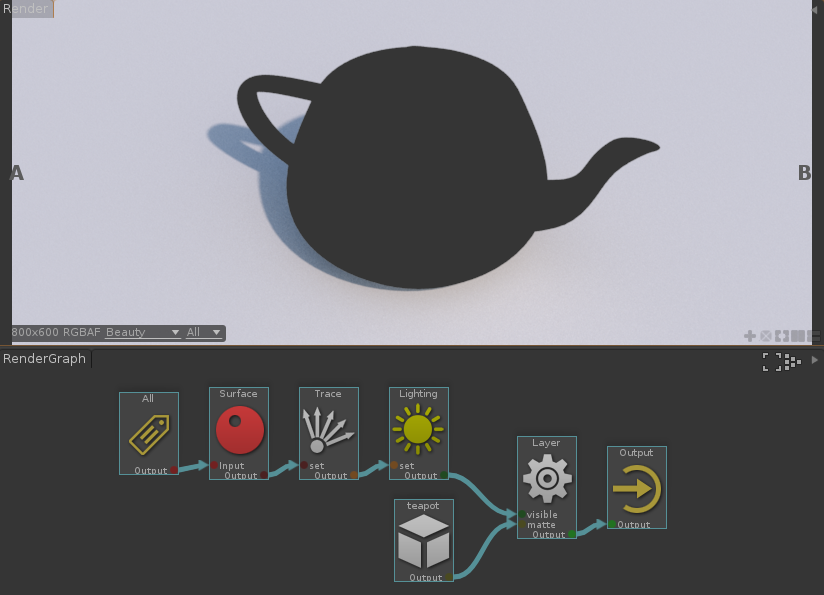 In the RenderGraph, connect objects in the matte input of the layer to render them as holdout matte.