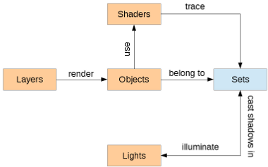 The following diagram explains the relationship between the scene elements and sets (scene elements are shown in orange, while sets are shown in blue:)