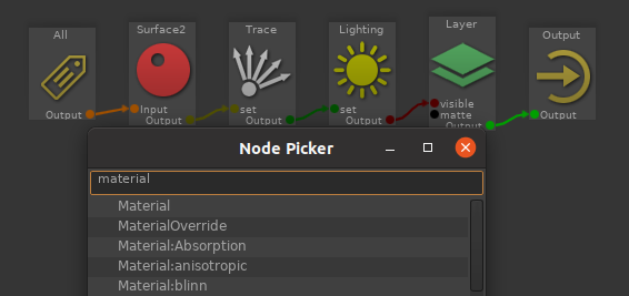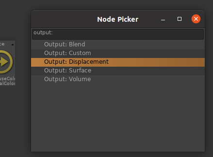 - Create a shader using the node picker (Ctrl+Space then type the node name you want, like 'surface', 'displacement', etc..)