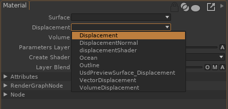 In the Material properties, select the appropriate surface, displacement and volume shaders: