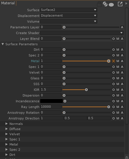 Unfold the Surface/Displacement/Volume Parameters to edit the shaders parameters:
