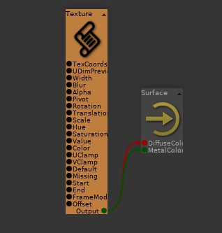Connect a shading network to both parameters. In the following example, a Texture is connected to both DiffuseColor and MetalColor parameters of the Surface2 shader: