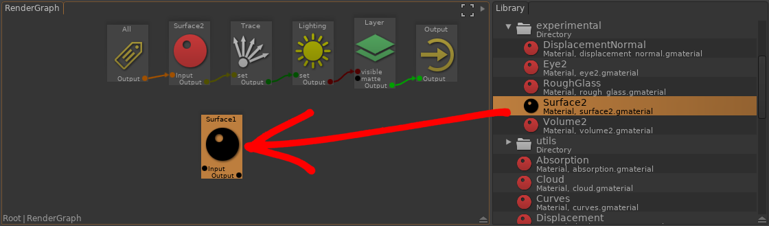 .. or select a node in 'Library > rendergraph > presets' - Insert the node in the flow by draging it over a connection (the mouse cursor should be over the curve).