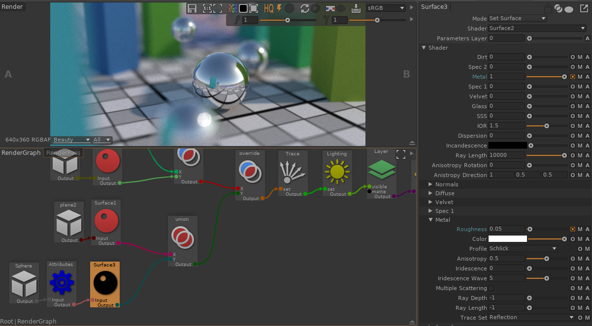 Select the shader node in the RenderGraph, then expand the Shader tab in the Properties to show all the material