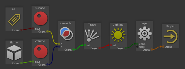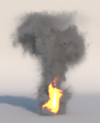 The Maya fluids are exported from Maya using the Guerilla Render plug-in as any other objects. Once in Guerilla, assign the Volume shader to the fluid object using the RenderGraph as usual and set the voxel attributes (like density, temperature, fuel) in the shader as explained below.