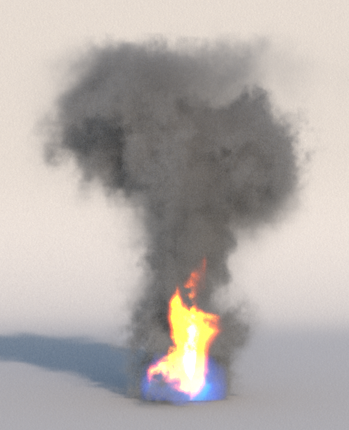 Create the shading network. The Volume -> Incandescence attribute is now controlled by the voxel's fuel channel through a custom color gradient.