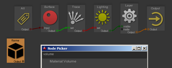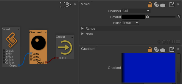 In this new shading network, add a Voxel node (in the library : "Attributes -> Voxel") and a Gradient node (Node Picker and type "gradient" and select "texture/Gradient").