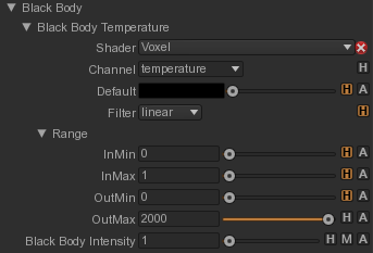 Tweak the density range using the Voxel -> Range -> OutMin/OutMax attributes. You may have to use a OutMax around 1000 or 2000 (Kelvin degrees). Tweak Volume -> Black Body -> Intensity to get the final incandescence.
