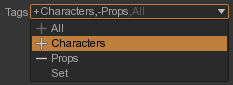 Guerilla comes with four predefined tags that you can use: All, Characters, Props, Set. By default all scene graph nodes have the All tag.